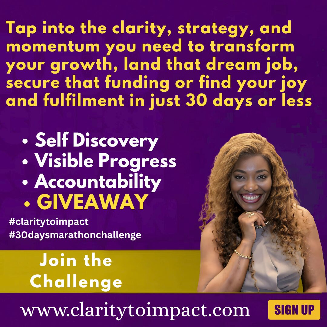 Have you been trying to land that dream job, secure that funding or find your joy and fulfilment? Join the 30-Day ClaritytoImpact™ Marathon Challenge and tap into the clarity, strategy, and momentum you need to transform your growth and achieve your mission in just 30 days or less.